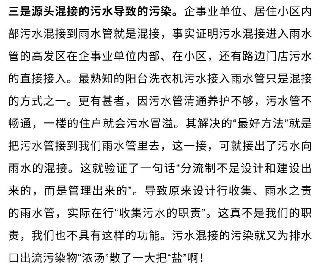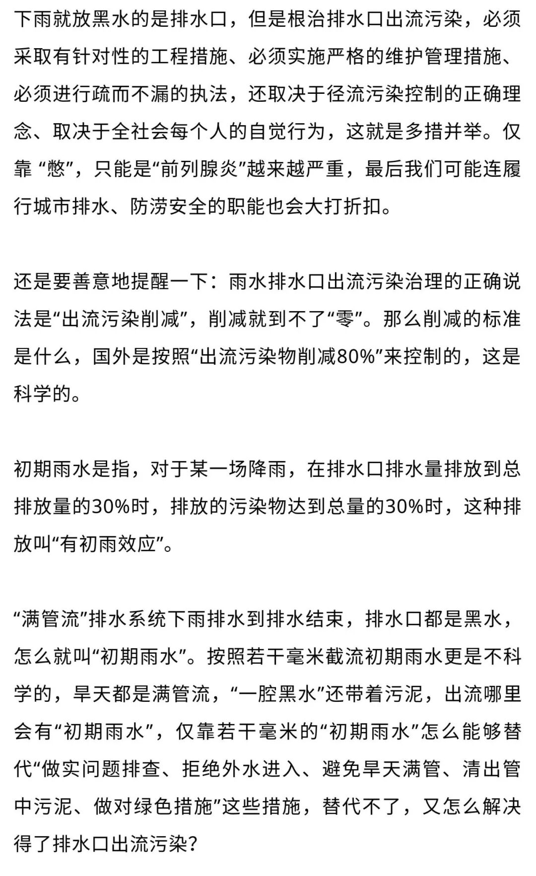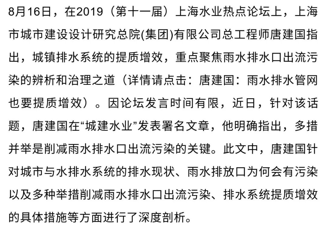 8月16日,在2019(第十一届)上海水业热点论坛上,上海市城市建设设计研究总院(集团)有限公司总工程师唐建国指出,城镇排水系统的提质增效,重点聚焦雨水排水口出流污染的辨析和治理之道(详情请点击:唐建国:雨水排水管网也要提质增效)。因论坛发言时间有限,近日,针对该话题,唐建国在“城建水业”发表署名文章,他明确指出,多措并举是削减雨水排水口出流污染的关键。此文中,唐建国针对城市与水排水系统的排水现状、雨水排放口为何会有污染以及多种举措削减雨水排水口出流污染、排水系统提质增效的具体措施等方面进行了深度剖析。