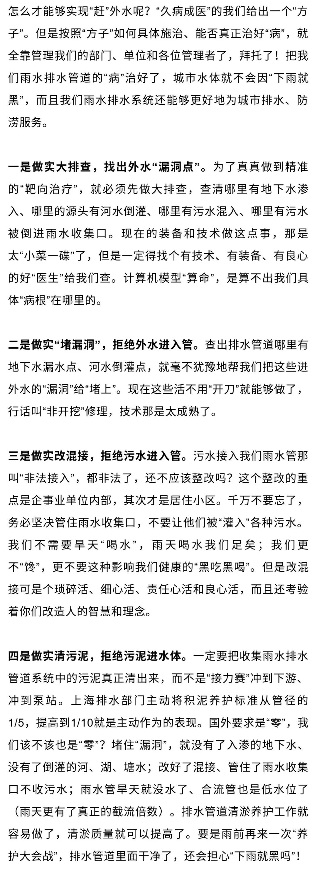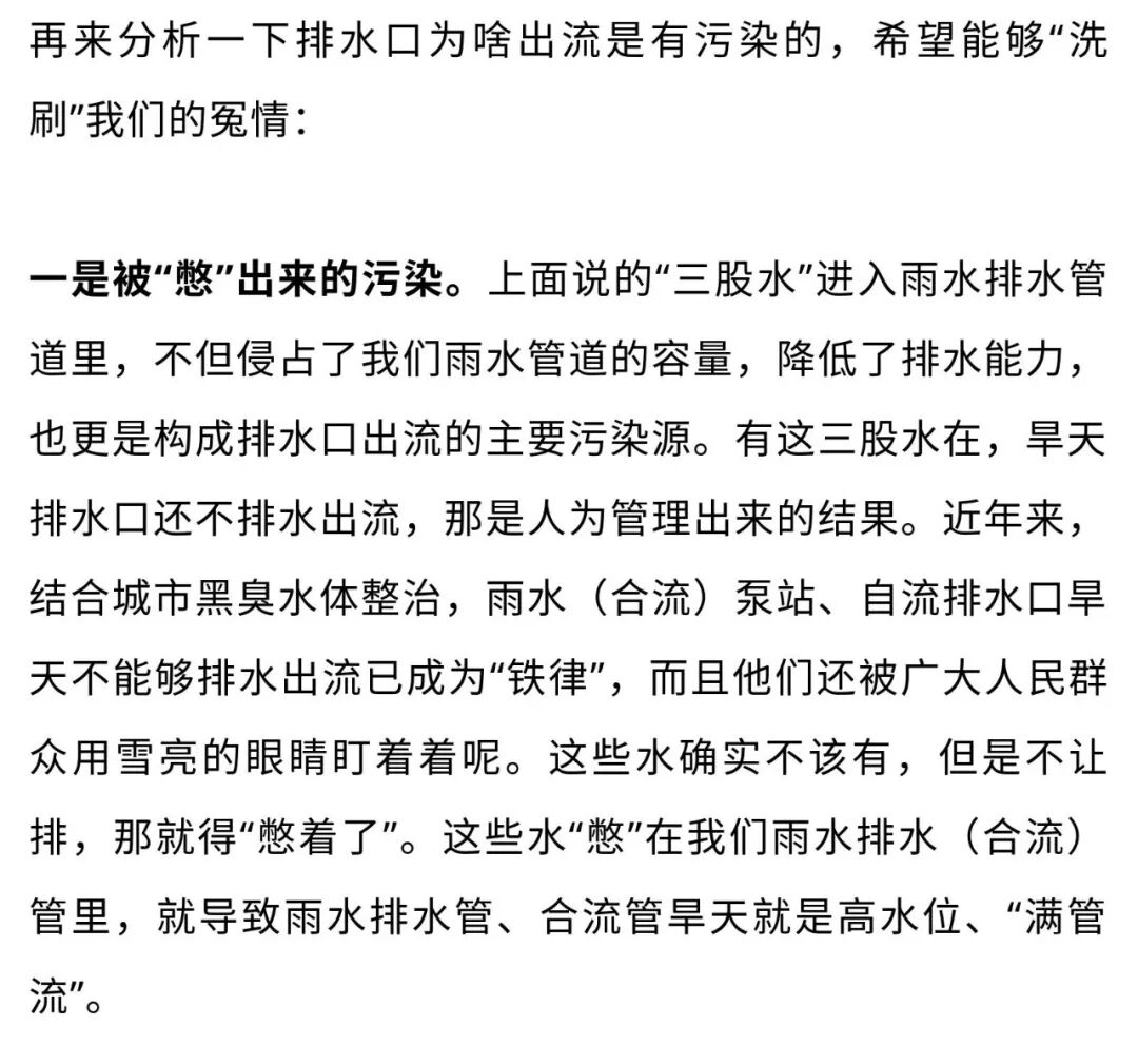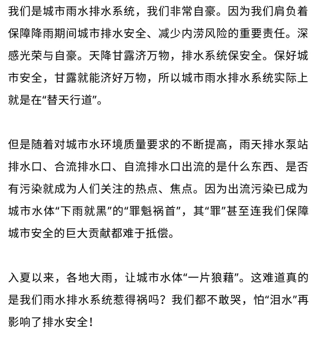 8月16日,在2019(第十一届)上海水业热点论坛上,上海市城市建设设计研究总院(集团)有限公司总工程师唐建国指出,城镇排水系统的提质增效,重点聚焦雨水排水口出流污染的辨析和治理之道(详情请点击:唐建国:雨水排水管网也要提质增效)。因论坛发言时间有限,近日,针对该话题,唐建国在“城建水业”发表署名文章,他明确指出,多措并举是削减雨水排水口出流污染的关键。此文中,唐建国针对城市与水排水系统的排水现状、雨水排放口为何会有污染以及多种举措削减雨水排水口出流污染、排水系统提质增效的具体措施等方面进行了深度剖析。