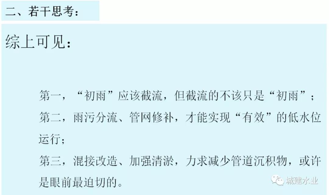——“清污分流”、赶外水重要性远高于雨污分流改造;污水处理厂进水污染物浓度是否得到有效提高,是考量“提质增效”工作的重要要素;让雨水管道旱天没有水是解决水体下雨就黑的前提!