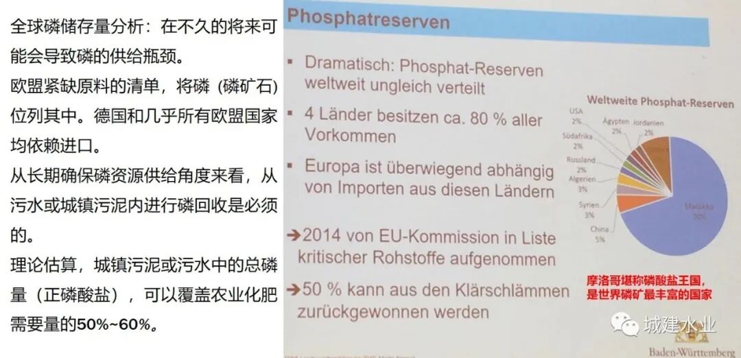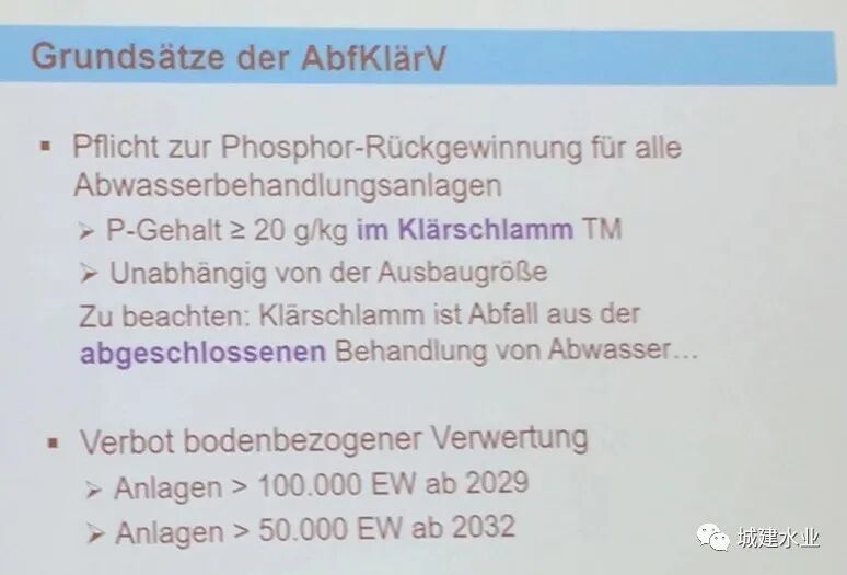 德国过去的10年污泥产量是呈下降趋势的,从2008年的205万吨(DS,下同)下降到2017年的171万吨。同样,物质利用率从2008年的47. 4%(97万吨)下降到2017年的30. 5%(51万吨)。相反焚烧处理率从2018年的52. 6%(108万吨)上升的2017年的69. 5%(1. 19万吨)。 ——巴登州共有污水处理厂904座,其中大于5万当量人口的仅87座。 ——共计服务当量人口1620万人,处理水量15.44亿立方米。 ——巴登州年产污泥量23.66万tDS(折含水率80%,118.3万立方米)。 ——折算单位当量人口产泥16.45tDS。 ——折算处理万立方米污水产泥1.53tDS(折折含水率80%,7.65立方米)。 ——1993年5月14日,德国推出“垃圾填埋条例” (TA Siedlungsabfall,简称TASi),只允许有机物含量不超过3%的垃圾物质才能填埋。这一法律经过12年过渡时期之后彻底禁止污泥填埋,2005年完全关闭了污泥填埋途径。 ——德国2005年全面禁止污泥填埋之后,污泥总体产量呈现稍微下降的趋势,主要原因是在污泥脱水过程中,石灰添加量下降。 ——2013年4月5日对“垃圾填埋条例”进行修订,允许垃圾填埋场存放合格的污泥焚烧灰分(灼烧减量<5%) 。 ——德国对多带带焚烧的灰分进行临时储存,目的是今后能够对其中的磷进行回收。 ——在2005年之后,以物质利用为基础的污泥处置量逐步下降, 相反热处置污泥总量不断增加。主要原因是德国肥料法规(DüMV)对污泥内有害物质的上限含量做出了十分严格的规定。 ——此外在污泥农用时,2015年出台了更为严格的德国肥料法(DüMV)。 ——德国肥料法(DüMV)规定:自2017年1月1日开始,2年内的生物降解能力至少超过20%的高分子絮凝剂才能被使用,希望工业界能够开发出完全和部分可生物降解的絮凝剂。 ——至2018年,对传统的高分子絮凝剂不进行用量限制。 ——自2019年开始,对无法证明具有至少20%可生物降解的絮凝剂来说,必须采取实施用量限制措施。 污泥农用时,每年输入农田的高分子絮凝剂不能高于15kg/公顷。但对于可部分或全部降解的高分子絮凝剂来说,则不受这一用量规定的限制。 2012年的德国循环经济法规定,污泥处理产物土地利用时,原则上德国肥料法(DüMV) 比污泥法规AbfKlärV更具有优先权。 ——德国城镇污水处理厂的污泥处理产物能否农用的争论一直在进行中。 反对农用的原因:城镇污泥内重金属、持久性有机污染物质、残留药物和化妆品等。 ——经过十多年的修订,德国污水处理厂污泥法(AbfKlärV)于2017年8月正式宣布生效。 新版法规明确规定:在规定的过渡期(12年或15年)之后,所有规模超过5万人口当量的污水厂都必须从污泥或者污泥灰进行磷回收,同时禁止污泥土地利用。 P含量大于20g/kgDS:大于10万当量人口厂,2029年执行;大于5万当量人口厂,2032年执行。 ——从2029年或者2032年全面禁止污泥的农用。 ——污水处理厂有义务进行磷回收。 ——磷含量>20 gP/kg DS的,必须将磷回收至<20 gP/kg DS,或者磷回收效率至少为50%。 ——磷含量高于40 gP/kg DS的,磷回收效率可以降低。 ——或者:承诺污泥进行多带带焚烧或协同焚烧,并从灰渣中回收磷,回收其中80%的磷;或者对含磷灰分/碳质残余物进行物质性利用。 ——根据填埋条例,可对含磷灰分/碳质残余物进行存放,存放期5年,以便对其进行磷回收;有政府批准,可以延长。 法律为德国在欧洲率先开始了污泥的磷回收先河提供了保证。 ——法规没有规定必须采用的具体磷回收工艺技术。污水处理厂既可以建造多带带污泥焚烧装置,然后从污泥灰中进行磷回收, 也可以采用化学结晶沉淀工艺进行磷回收(例如鸟粪石MAP工艺)。 ——目前从城镇污泥(污水)进行磷回收的技术不完全成熟,从城镇污泥灰中进行磷回收的工艺,德国尚无大型运转的成功经验,故法规为大面积采用磷回收工艺提供了足够的过渡时期。 ——在采用化学沉淀结晶工艺的城镇污水处理厂内, 一般都可以产生磷酸铵镁(MAP)。但规定, 采用此工艺必须保证被处理后的城镇污泥内磷含量<20 g P/kg DS或者至少降低污泥内磷含量50%,回收之后的磷大部分作为肥料或者进一步加工制成化肥。 ——当城镇污泥在多带带焚烧装置或者在等价的混烧装置处理时,必须至少将污泥80%的磷回收利用,这样才能保证在热处置过程中的磷回收效率高于普通的化学沉淀结晶方法。 ——PRISA工艺是从污泥处理过程中浓缩、脱水液中回收磷。 ——三种工艺水中含磷的形态不一样。经过一定的化学处理之后,回收到磷酸铵镁MAP。 ——采用强化生物除磷工艺,否则污泥处理过程的工艺水中的磷的含量就比较低。 其磷回收率大于50%,满足德国新"污泥条例"对于磷回收率的要求。 ——PASCH工艺是从污泥焚烧的灰分中回收磷。 ——该工艺磷回收率要大于90%。 ——回收产品的无机杂质含量低。 ——该产品具有良好的植物可利用性。 ——示范项目运行表明,PASCH工艺具有较低的成本。 ——在污泥焚烧中,要将能源利用和磷回收结合起来; ——磷回收设施是分散还是集中? 磷回收要与污泥处置紧密结合起来! ——德国焚烧处理的污泥总量中,污泥多带带焚烧处理量和在燃煤电厂混烧处理量,大约各占一半;只有少量污泥是在水泥窑和垃圾焚烧厂内被处置。 ——如果磷含量少于2%(以干物质计算20gP/kgDS),方可允许混合焚烧。 ——为了降低从焚烧灰渣中提磷的成本,德国在尝试焚烧灰直接用于农业,这就是鼓励污泥多带带焚烧的原因。 ——在今后的15