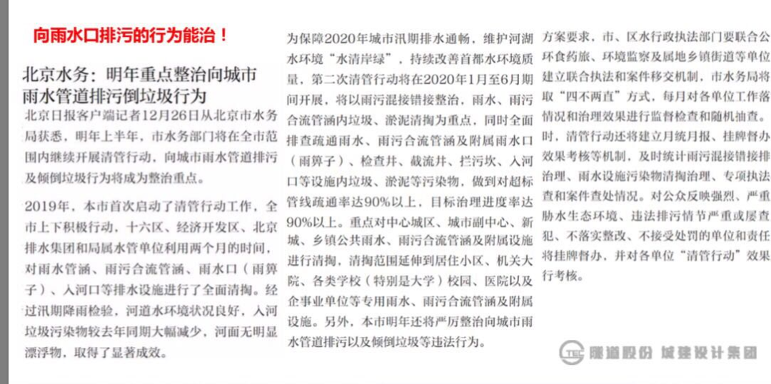 在我国现状雨污不分,合流不像的情况下,“大排查”不仅是内容上的大排查,而且排查设施也要涵盖到雨水管、山水渠箱等。