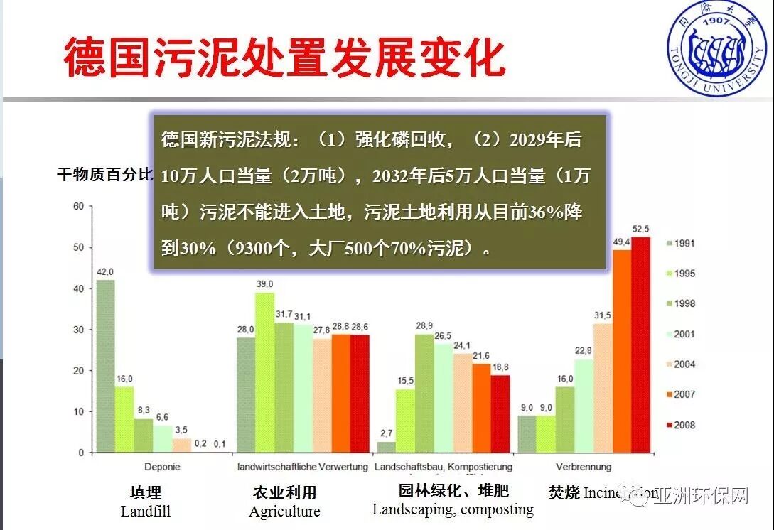 以欧盟为例,欧盟提出“倒金字塔”的五层原则,它的土地利用基本上在50%左右,和美国相当。最近网上流传德国禁止污泥土地利用,这是一个错误观点。新标准要求到2032年,德国9300个污水处理厂中500个大型处理厂达到磷回收的效果,土地利用量从现在的36%降到30%。其目的主要是为了强化磷回收,因为德国认为磷是战略资源,可以满足其农业和粮食安全的30%~50%的要求。