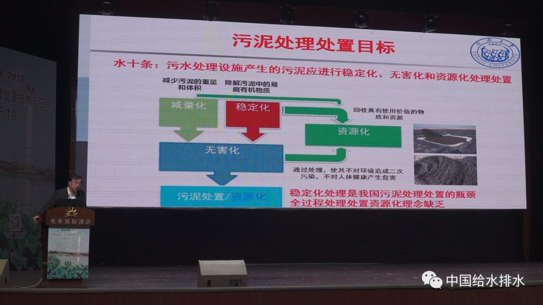 这个是我们在前面取得的一些成效,但是离我们的目标还是有很大的差距,“水十条”明确了污水处理的设施产生的污泥应该进行稳定化、无害化和资源化的处理处置。当时也有相应的时间节点,现在看来离“水十条”的要求还是有一定的差距。至于污泥处理处置,里面主要是污水当中的易降解的有机物以及重金属等污染物,从处理处置来说,到底是应该遵循什么样的基本原则和目标?我们都知道污泥污水处理处置原来一直提到的是“四化”——减量化、稳定化、无害化和资源化,这个是我们一直挂在嘴上的,但是其实这个"四化"目前以及未来还是指导我们污泥处理处置很重要的基本原则。作为减量化来说是降低污泥的体积,因为它含水率比较高,同时还有一个很深层次的含义,要把污泥的量通过机械或者其他的方式降低。那么作为稳定化来说,这个也是我们国家现在污泥处理处置的短板,因为污泥当中有大量易腐的有机物,而这些易腐的有机物容易产生恶臭,容易到水体再进一步消消耗水体的氧气,进一步的生物降解,所以容易产生二次污染。为什么世界上的发达国家对污泥的稳定化有一个明确的要求,也就是说污泥出了污水厂之前必须要对污水厂没有处理掉的这部分的易降解的有机物要处理完,才能运出污水厂,所以稳定化也是相当重要;无害化是涉及到后续的处置,比如说污泥当中含有重金属等其他物质,怎么样通过一些处理手段,根据处置的要求去实现无害化的处理;资源化提的是在减量化、无害化、稳定化的过程当中,应该采取更加能够资源回收的技术路线,所以减量化、稳定化、无害化、资源化是这样一个关系。