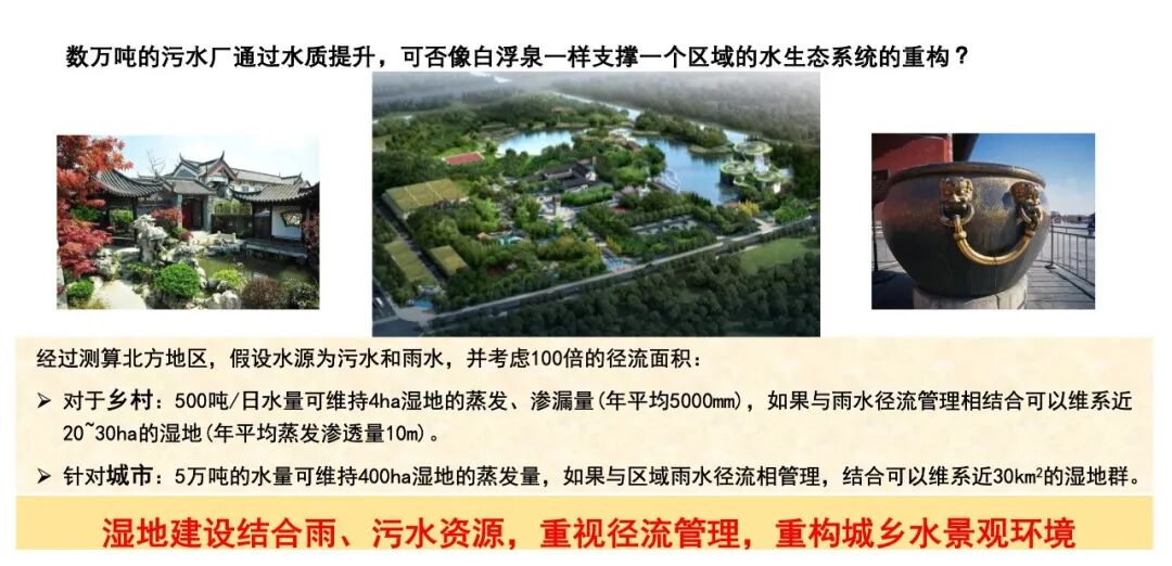 基于以上分析,若污水厂数万吨的流量,通过水质提升,可否像白浮泉一样支撑一个区域的水生态系统的重构?我们现在来进一步计算,如果径流管理合适,在农村一个500吨的污水处理厂可以保持20-30公顷的湿地。而在城市,一个5万吨的污水处理厂,可以维持近3000公顷的湿地群。当然,我们也给出了一些具体的假设条件,如渗透系数、蒸发量等等,这里不再赘述。