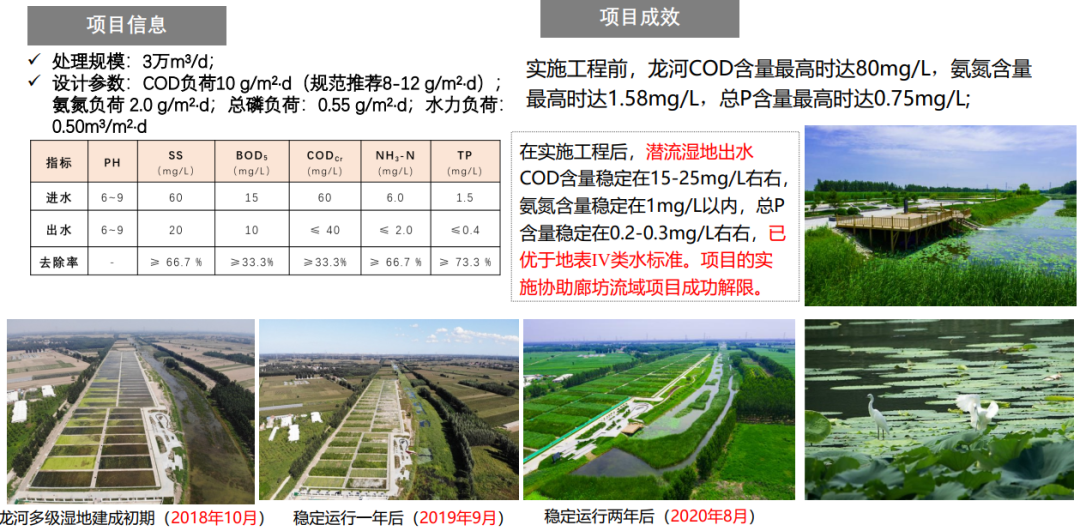 当时的设计要求已经达到了比较高的水平,起码是达到了Ⅴ类水以上的要求。从2018年10月建成到2020年,稳定运行两年后可以看湿地大概3公里河道的效果,水质主要指标也达到了Ⅳ类水的水质要求,现在这三年,龙河不光摘掉了劣Ⅴ类水的帽子,建成了一个湿地公园,从而协助廊坊解除了限批的要求。现在,这里的生态环境也非常好,解决了河道不达标的问题,各级政府和相关新闻都对此进行过报道。