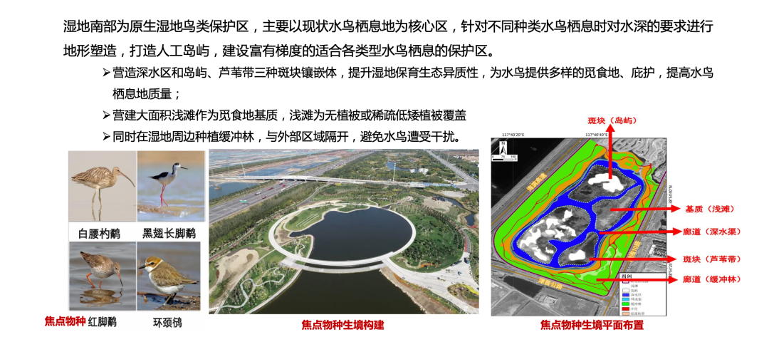 人工湿地对生物多样性的保持是非常有效的。以天津临港湿地二期为例,该湿地除作为科普宣教区和人工湿地区,还包含原生湿地鸟类保护区的功能。原生湿地鸟类保护区在湿地的南部,主要以现状水鸟栖息地为核心区。针对不同种类水鸟栖息时对水深的要求,进行地形塑造,打造人工岛屿,建设富有梯度的、适合各类型水鸟栖息的保护区。所以,湿地虽然不大,运行状况非常好。