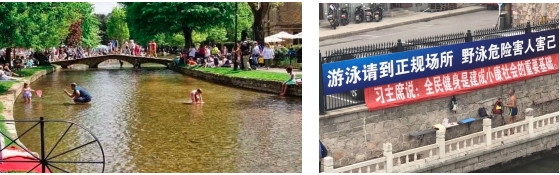 我举个例子,在某城市河道处,总有一些市民去冬泳。为此,水务局相关部门专门在河边悬挂了一个条幅,上面写着“游泳请到正规场所,野泳危险,害人害己”。冬泳的老百姓表示不满,又挂了一个横幅,上面写着“习主席说全民健身是建成小康社会的重要基础”。上图左侧图是国外的一个河道,亲水是第一要素。美国对河道的法律法规非常繁琐,但是其核心要求是“可游”、“可渔”。这两个要求非常简单,前者要求水质市民可直接接触没有危害性,后者则要求水质不引起生物变异,产生生物链效应,危害人类。