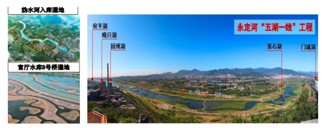 目前,围绕京津冀水专项最重要的一条河道——永定河5个生态节点建设了湿地群。其中,八号桥湿地和妫水河湿地有效改善了官厅水库的入库水质。北京的新首钢五湖一线建成,极大改善了永定河的生态环境,形成水面180 hm2,绿化300 hm2。