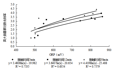 ORP可以反映溶液的氧化还原性。其值越高,溶液的氧化性越强;反之,其值越低,溶液的还原性越强。有文献报道了ORP值与氯对一些微生物和细菌的杀灭效果高度相关。本研究表明,粪大肠菌群对数去除率与反应后水样的ORP值呈现较好的对数相关性,如图3所示,接触时间5、12、30 min的相关系数(R)值分别为0.8680、0.7971、0.8706,推测出现这一相关性正是由于水中投加了次氯酸钠这类氧化剂后,引起水质的氧化还原电位发生了改变。考虑到粪大肠菌群数等致病微生物指标的检测周期一般需要48h,目前部分欧美发达国家已普遍采用ORP值控制泳池水的消毒效果。因此为简单快速预判污水处理厂出水粪大肠菌群的去除效果,建议在出水排放口处安装在线ORP仪以辅助判断消毒效果。