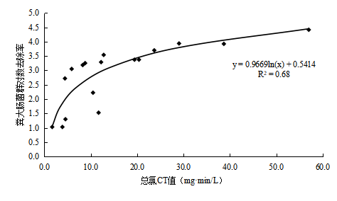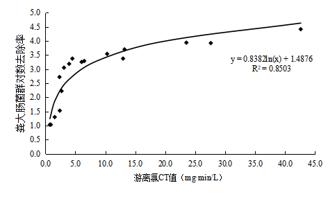 图5 游离氯CT值与粪大肠菌群对数去除率的相关性