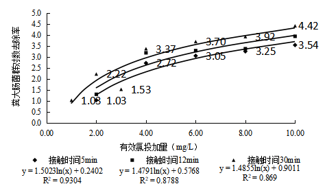 粪大肠菌群对数去除率 | 余氯 | 接触时间/min | ||