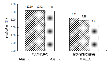 为研究次氯酸钠有效氯含量随时间的变化规律,将次氯酸钠原液避光加盖保存3d,每天检测其有效氯含量,同时与3d内现场储药罐中同批次次氯酸钠的有效氯含量作对比。如图8所示,可见保存方法得当的次氯酸钠原液的有效氯含量并未发生明显改变,而现场储药罐内次氯酸钠的有效氯含量却发生了明显的衰减,且日均衰减速率超过10%。这主要是由于现场储药罐存在罐体上盖密封不严、露天暴晒、灌注新药时罐内旧药余量过多等问题。有效氯含量的变化也会影响次氯酸钠投加量的准确性。因此建议污水处理厂应重视对次氯酸钠试剂的现场管理,宜采用避光(黑色或深色)、密封(留一出气口)、耐腐蚀(如聚四氟乙烯)的罐体存储,并尽量在使用至低液位处再灌注新药。