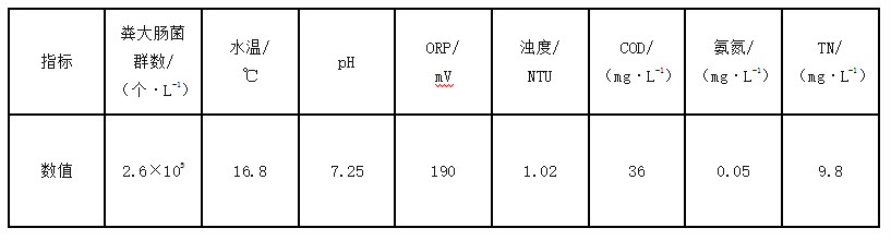采集加氯点前二沉池出水20 L作为试验用水,检测粪大肠菌群数、ORP、氨氮、TN、COD、浊度、pH、水温等水质指标。