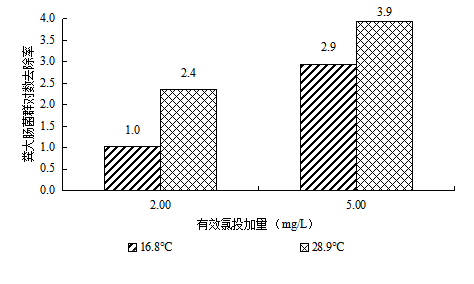 试验水样中有效氯投加量为2 mg/L和5 mg/L时,分别在水温为16.8 ℃和28.9 ℃下接触消毒5 min,结果如图6所示,可见水温对粪大肠菌群对数去除率有显著影响。在相同的有效氯投加量下,水温升高可明显提高粪大肠菌群对数去除率,这可能是由于温度的提升使得次氯酸扩散至微生物表面的速率变快,进而提高了穿透细胞壁发生氧化作用使其死亡的概率。因此在为了达到近似的粪大肠菌群对数去除率的前提下,夏季水温较高时可适当减少次氯酸钠的投加量;而在冬季水温较低的环境下,可通过加大有效氯投加量或者适当延长接触时间达到相同的消毒效果。