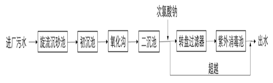 本文研究对象为执行一级A排放标准的某城镇污水处理厂,该厂目前的处理能力为22万m3/d,工艺流程如图1所示。该厂目前转盘过滤器和紫外消毒池均处于停运维修状态,现场加药点位于二沉池出水渠末端,消毒接触在二沉池至出水排放口(超越转盘过滤器和紫外消毒池)的管道内完成,根据日均流量、管径和管长等参数计算,得出接触时间约为12 min。加氯消毒试验用水取自该厂二沉池出水,水质参数见表1。