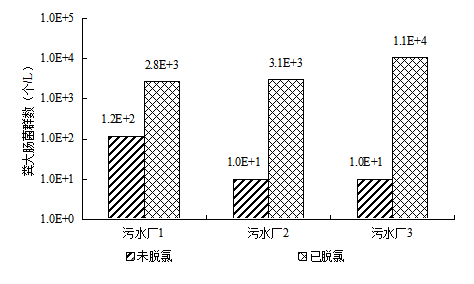 为研究脱氯对检测水样中粪大肠菌群数的影响,在3座污水处理厂总排放口处分别取经次氯酸钠消毒后出水水样,一组在现场使用硫代硫酸钠脱氯,一组为未脱氯作为对照组。经标准方法检测后发现,未脱氯水样中的粪大肠菌群数明显低于已脱氯水样中的粪大肠菌群数(见图9)。另外,从3座污水处理厂的出水对比数据来看,已脱氯水样中粪大肠菌群数可超出未脱氯水样的10~1000倍不等,说明余氯的存在会严重干扰粪大肠菌群数检测的准确性,从而影响对实际消毒效果的准确判断,因此建议采样时应对水样进行脱氯处理。