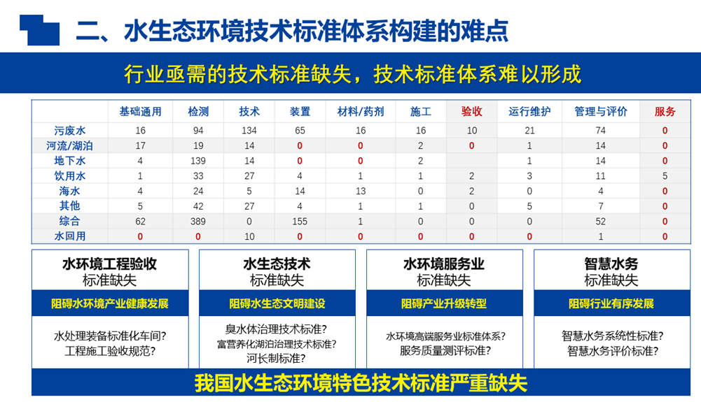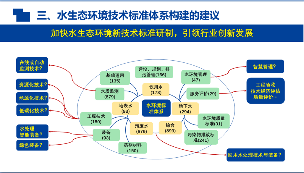 水生态环境技术标准是实现水环境质量标准目标的重要手段。技术标准包括基础标准、产品标准、管理技术标准、信息标准、工艺标准、检验方法标准等等,是一个完整的闭环体系。在这个体系里面,从技术标准化,到行业规范化,再到水环境生态化,技术标准都将起到非常重要的作用。同时,水环境治理和水生态修复攻坚数年,经验化模式亟待突破,亟需健全水生态环境技术体系来推动产业精细化和高端化发展。